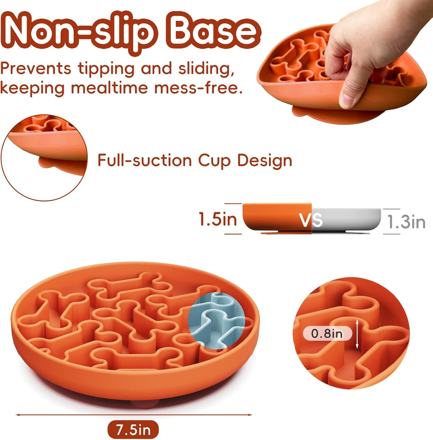 Silicone Slow Feeder Dog Bowl – Orange Bone Pattern | Food-Grade Non-Slip Dog Dish for Anti-Bloat, Fast Eating Prevention, 7.5” x 1.5”, Dishwasher Safe