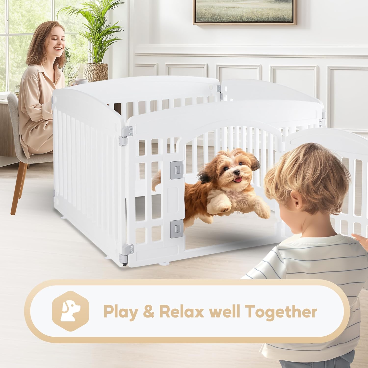 Safe & Secure Area: Simple Deluxe dog playpen crafted with rounded corners and sturdy structure, built with multiple panels, exercise pet playpen with door is excellent for play yards, play gates, providing a comfortable space to play and relax for dogs