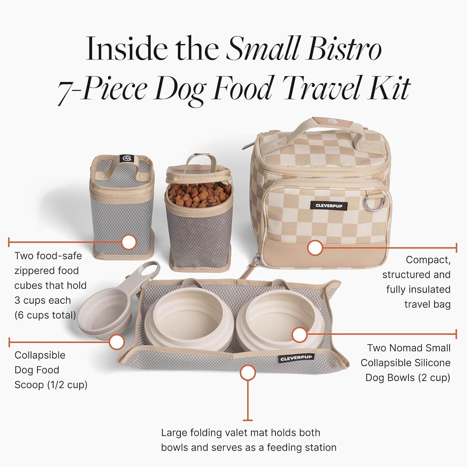 Small 7-Piece Bistro Box Dog Food Travel Kit, 6-Cup Kibble Storage, 2 Silicone Bowls, Mat & Scoop – Premium Portable Pet Food Kit for Weekends, Overnights, Daycare & Camping, Checkerboard