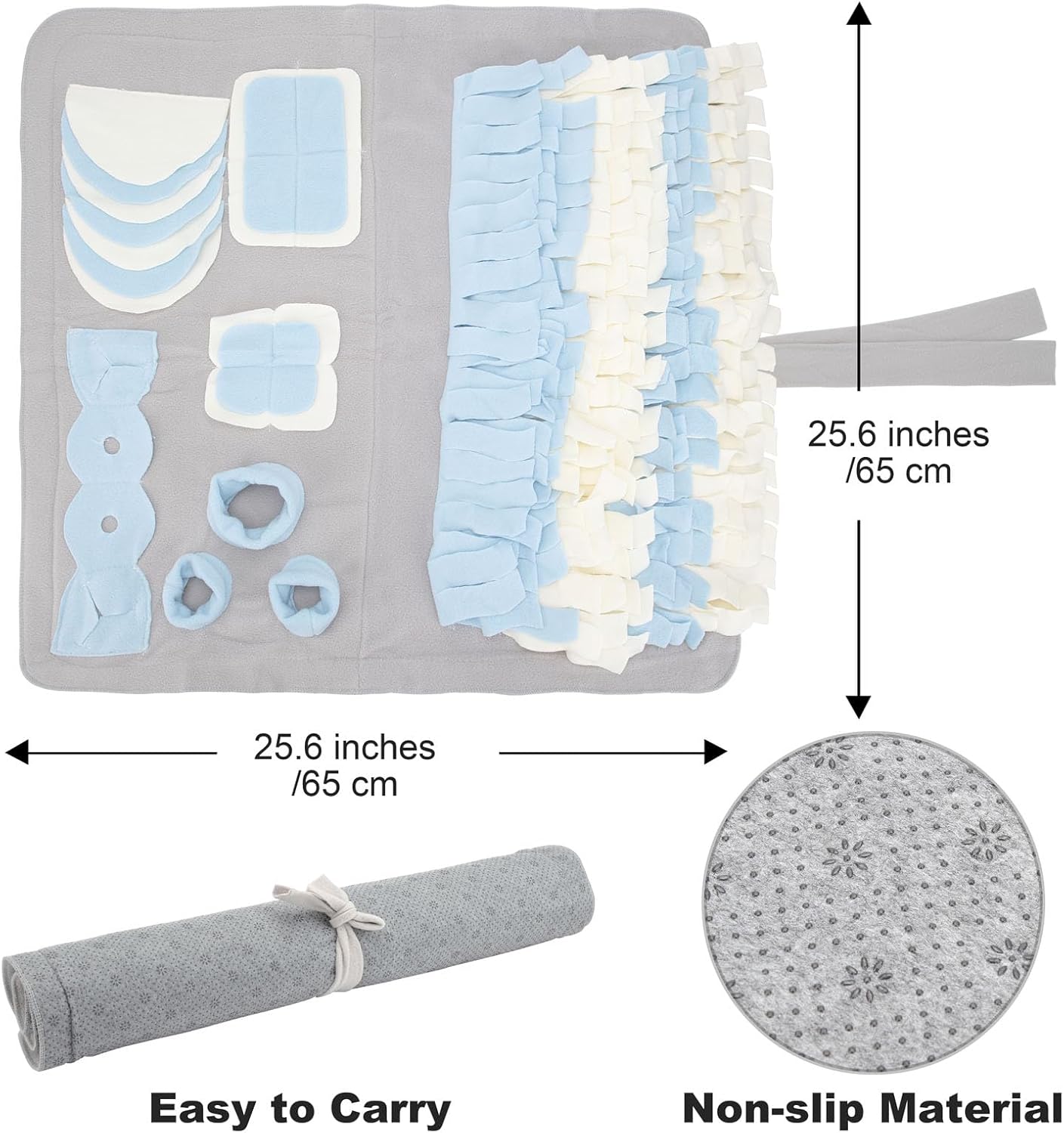 NON-SLIP & TRAVEL-FRIENDLY. The anti-slip design of the underside allows the mat to rest firmly on the ground , and the snuffle can be folded and put into storage bag, easy to carry.