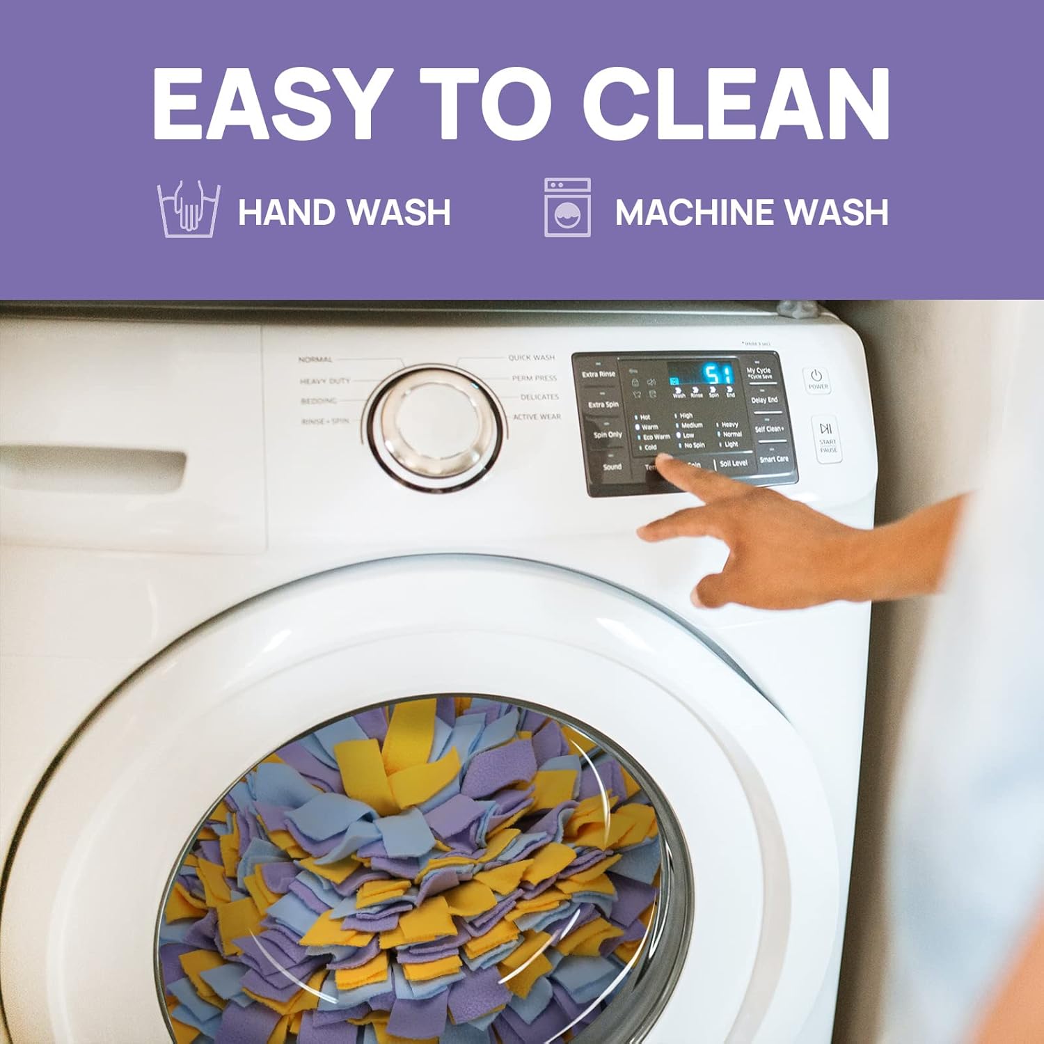 Our snuffle mat is made of soft fabric, easy to clean. Machine washable and hand washable, just hang up to dry.