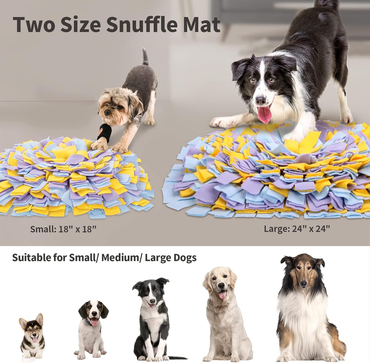 【2 Sizes and 3 Colors】: Our snuffle mat has 3 colors and 2 sizes, large size is 24”x24”, small is 18″ x 18″, Suitable for small, medium, large dogs, cats, any animal with foraging instinct. Indoor dog training mat builds interaction between owner and pet, and binds you and your pets relationship quickly.