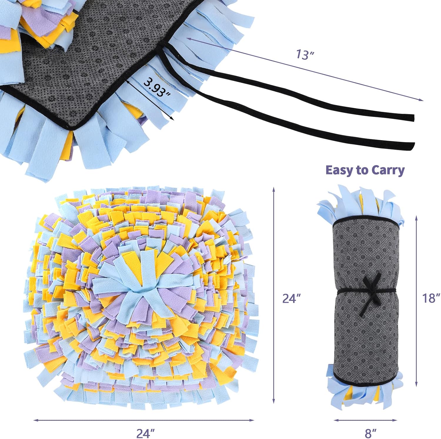 【Anti Slip & Foldable Design】The anti slip bottom is designed with a rope, that effectively holds the mat and prevent pet from tipping over or moving. Tie the rope on the furniture, no longer worry about the snuffle mat disappear. The lightweight and portable snuffle mat can roll up for storage anywhere, suitable for pet indoor and outdoor activities.
