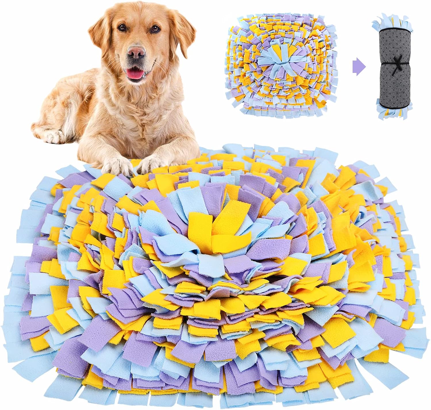 Snuffle Mat for Dogs, Durable Pet Sniff Mat 24” x 24” Foldable Dog Food Feeding Mat Washable Interactive Dog Puzzle Toys for Bored Small Medium Large Puppy Cat Rabbit (Yellow Purple)