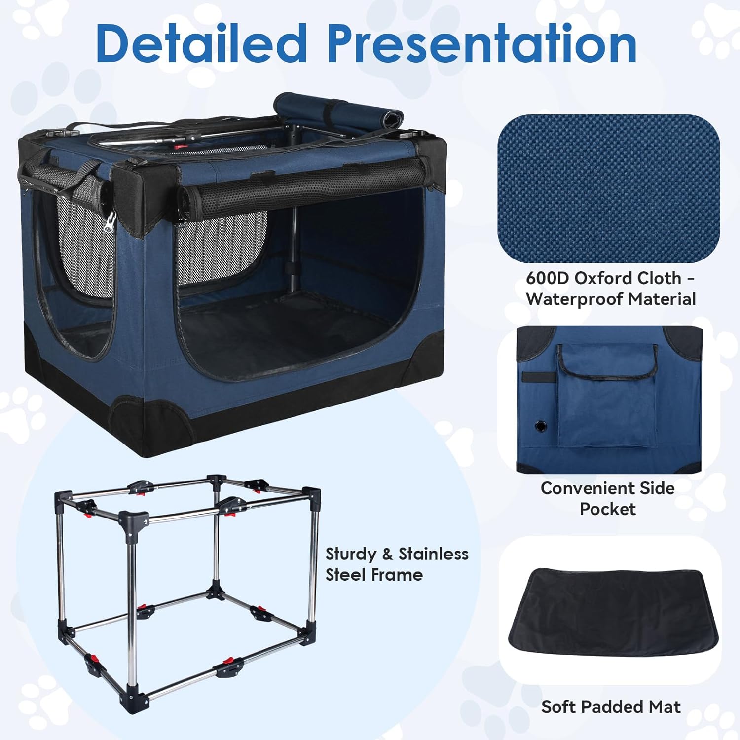 【Quick Assembly & Storage】The soft travel cage for dogs is fully assembled and can be set up and folded down in seconds, without requiring any tools. Its waterproof fabric and detachable washable mat keep your pet dry and cozy while resisting spills, mud, and moisture. To save you the inconvenience of returning the crate, we kindly urge you to measure your dog accurately. Ensure that the blue dog crate is the right fit for your beloved pet