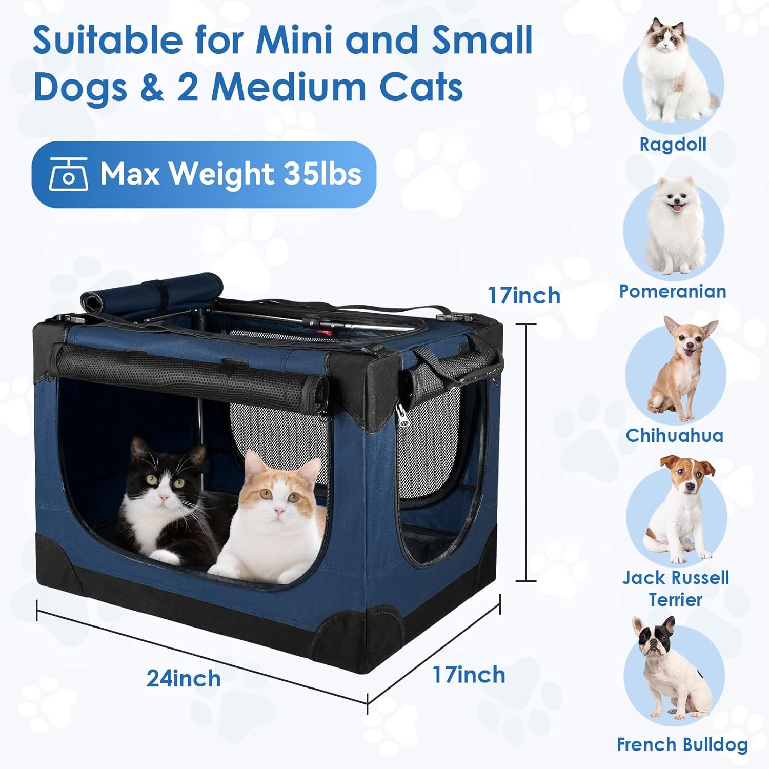 【Ideal Size for Small Pets】Measuring 24″(L) x 17″(W) x 17″(H), this portable dog kennel comfortably accommodates small dog breeds. This dog car carrier can hold a maximum of 35 pounds of pets. The spacious interior provides a comfortable and secure environment, making it suitable for puppies, cats, or as a convenient travel den during car rides, visits, or overnight stays