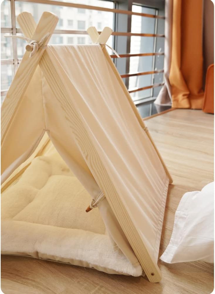 Solid Wood Cat Indoor Tent with Thick Mat,Portable Dog House Dog Teepee Tent,Cute Cat Teepee Cave Cat Bed,Dog Bed (Off White, M)
