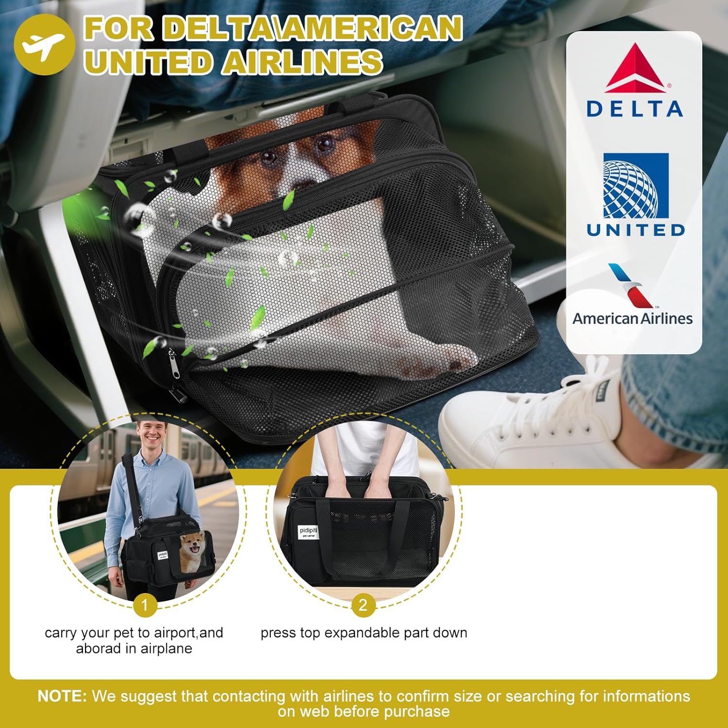 ↓↓【Something You Need To Read Before Purchase】→→1.【FOR DeltaAmerican\United airlines】size of carrier is 17(L) x 11(W) x 11(H),it’s approved by DeltaAmerican\United airlines(require size of carrier 18x11x11), but NOT APPROVED BY jetbluesouthwest laska llegiant rontierspirit,it is higher for them.