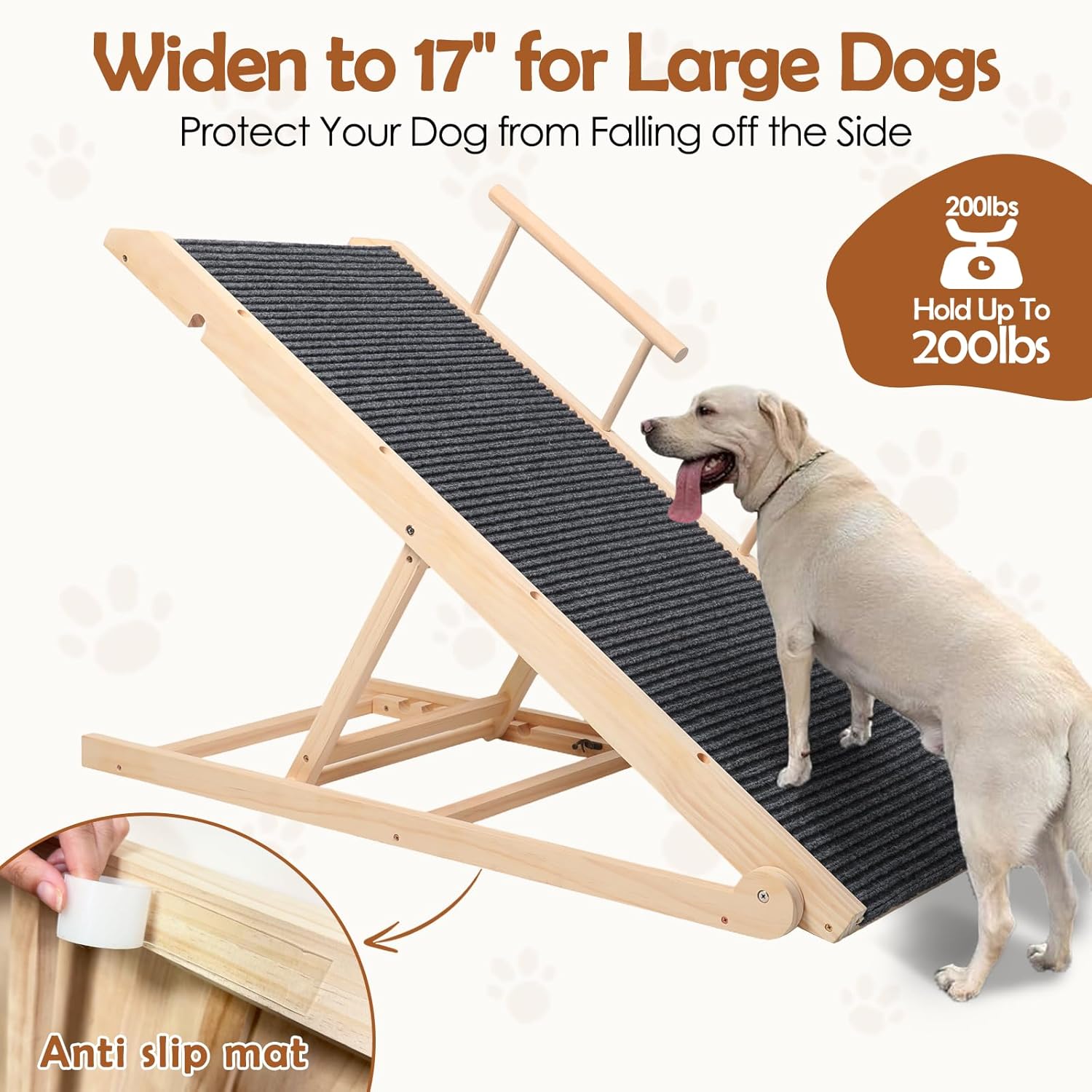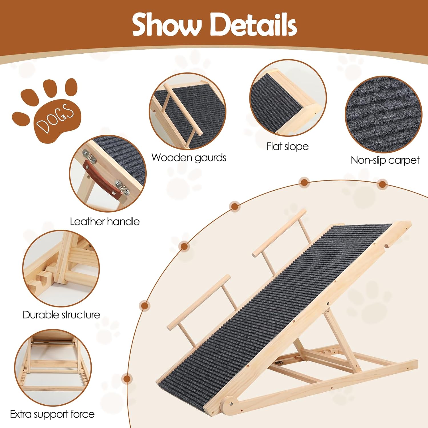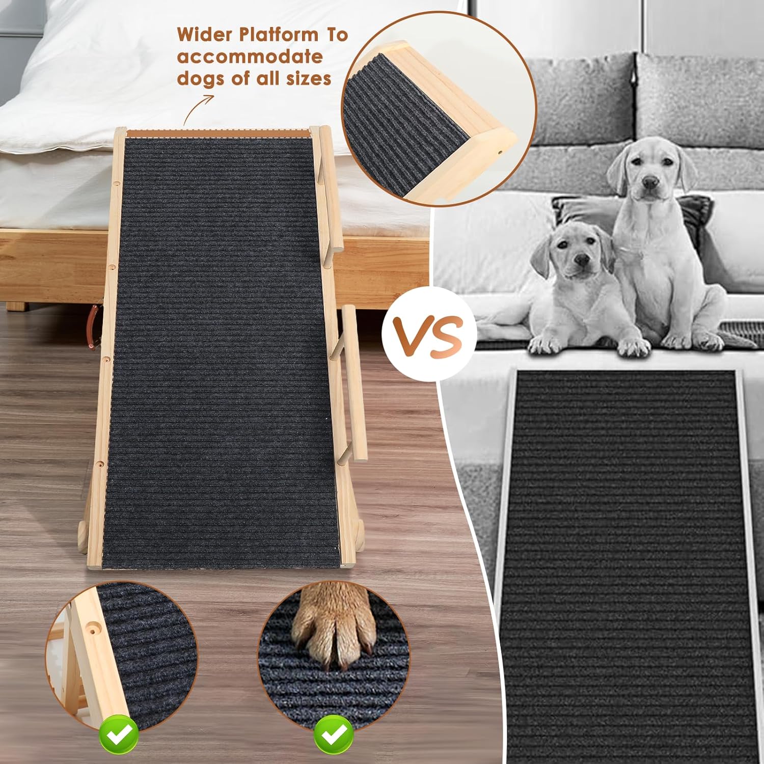 Dog Ramp for Bed and Couch: 47.2″ Long 15.7″ Wide, Adjustable Heights up to 27″ TallAdjustable Height: Multi-function ramp can be used as car ramp and a staircase. It can meet the needs of pets of different sizeEasy to Carry: The dog ramp has a special carrying handle so that the base and walking surface do not separate, so you can easily carry it indoors or outdoors.Extra wide pet ramp: It provides enough width for pets to feel confident when going up and down, with no worry of falling off the sides.Anti-Slip Dog Ramps: Dog ramp features a unique traction fabric carpet embedded with 6 stable on its surface, ensuring enhanced grip and stability for your furry friendUnlike Typical Pet Ramps: Our railings on both sides can be adjusted according to your needs on both sides of the ramps Ensure that the dog does not fall off the ramps