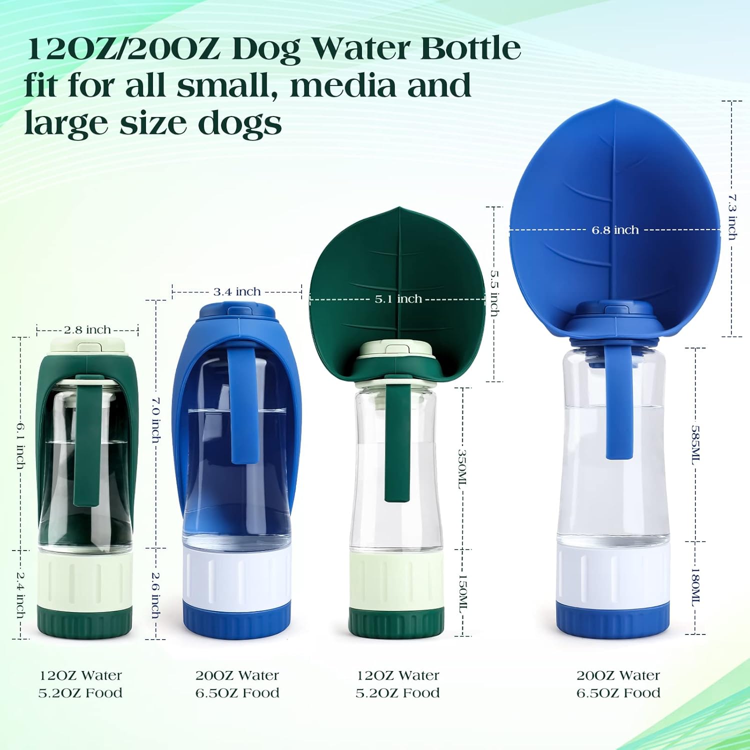 2-LAYERS Dog Water Bottle and Food Container: Which can hold 12OZ water and 4OZ food. Enough for taking your small and medium breed dog for outdoor walking, hiking, traveling