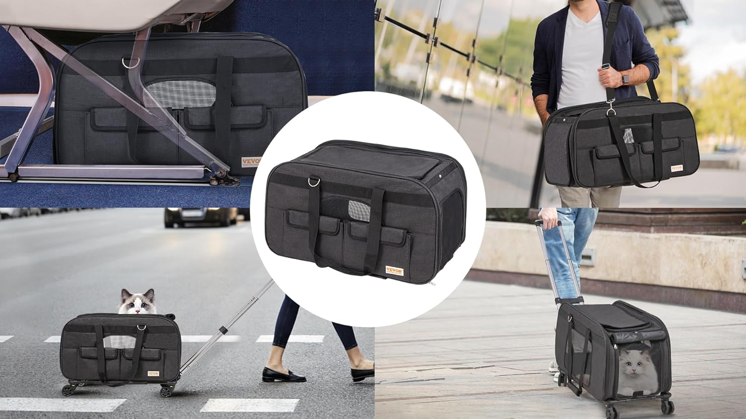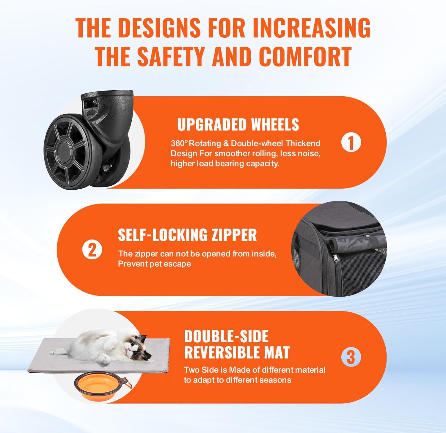 UPGRADED WHEELS DESIGN: VEVOR rolling dog carrier wheel is improved. It not only is 360° rotating smoothly, but more importantly it features double-layered, thickened and wear-resistant design with a 2.3-inch diameter. It will be more durable and quieter. It ensures a bump-free journey on various road surfaces for your pet.