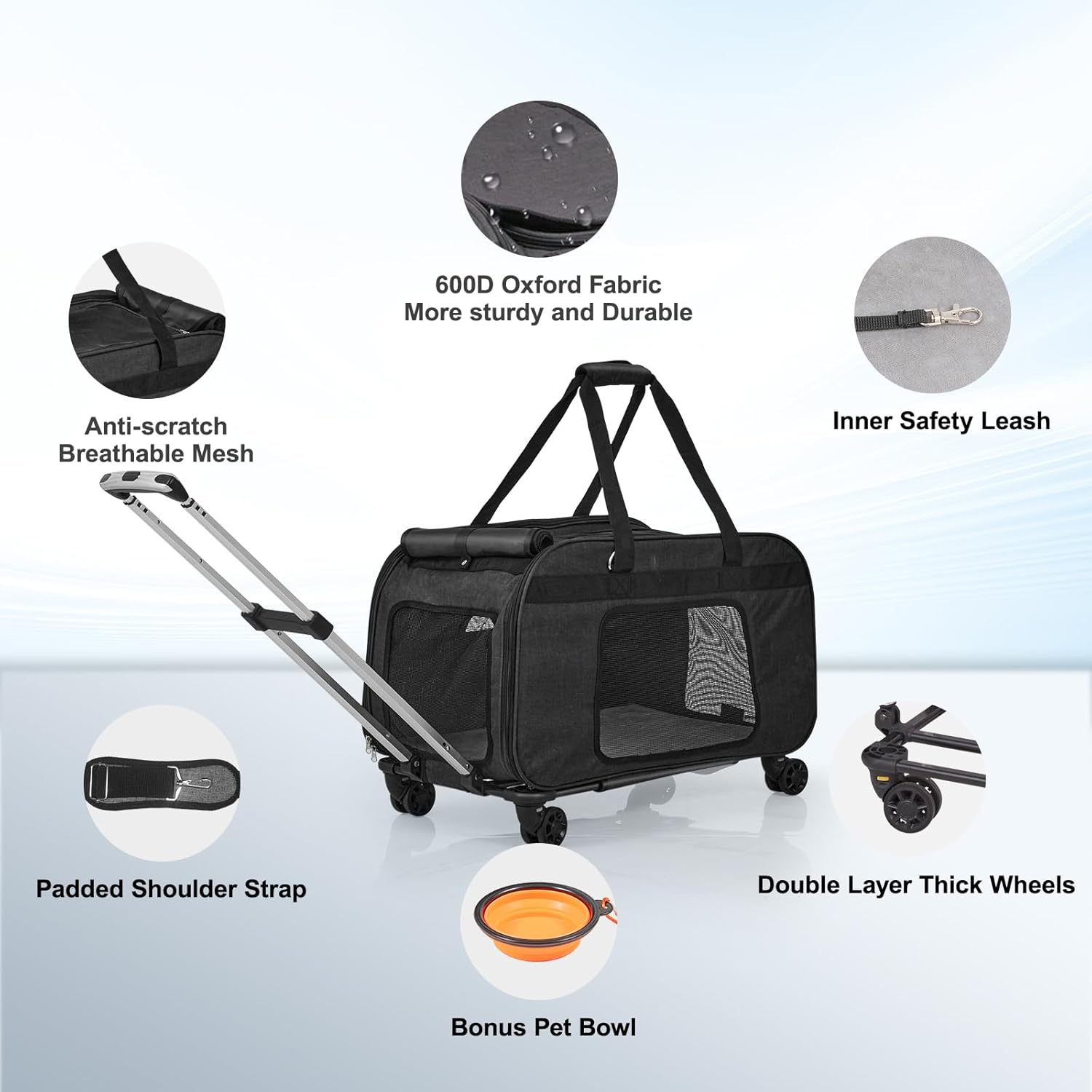 LARGE CAT CARRIER&DURABLE:Made of 600D Oxford cloth thickened fabric to ensure the durability and sturdiness. The size of pet carrier is 25.5″/65cm (L) x 14″/36cm(W) x 14″/37cm (H) and can hold up to 35lbs/16kg. Please check the size and weight of your pet to determine if the room of this rolling pet carrier is enough.
