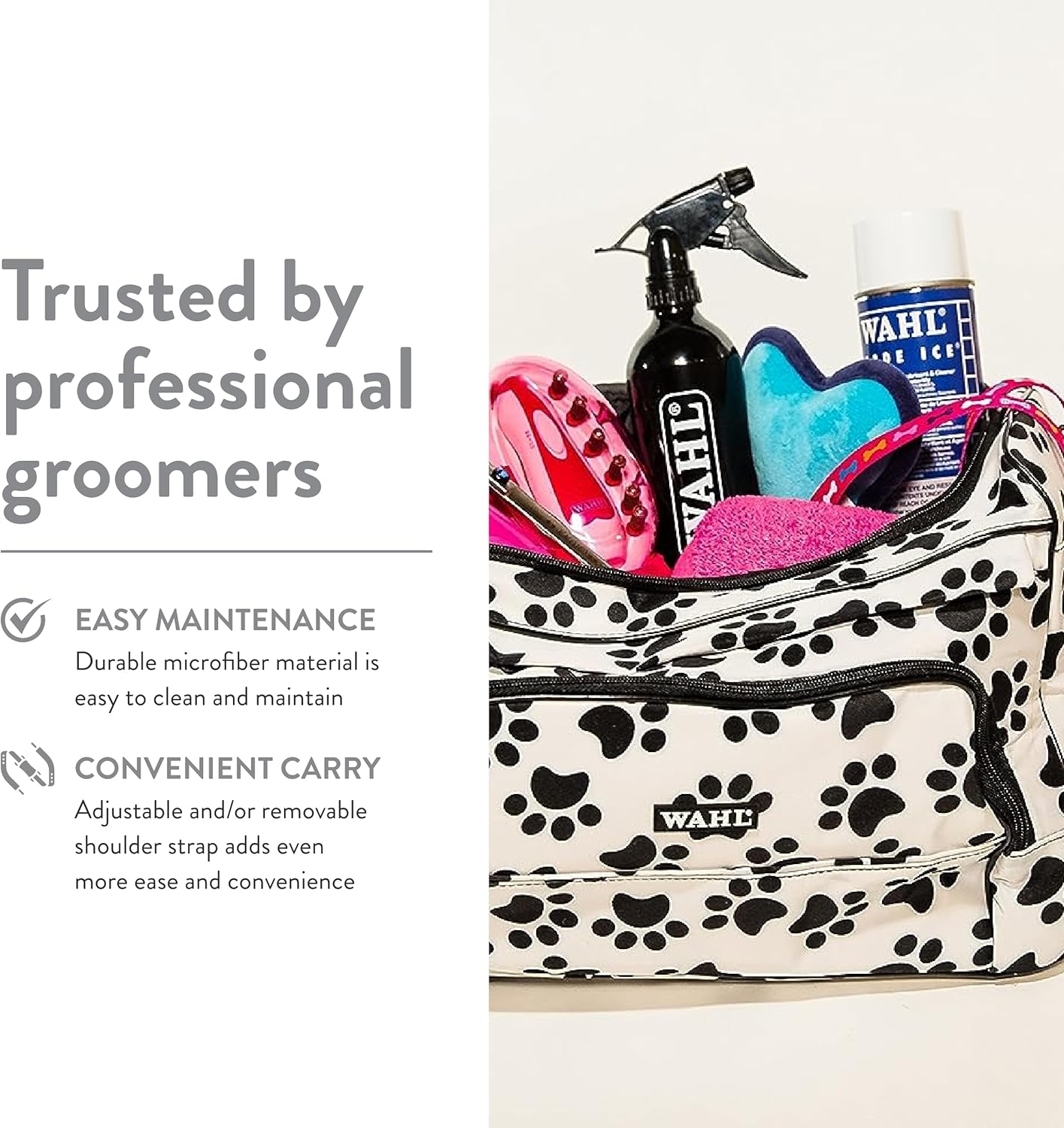 Wahl Professional Animal’s Paw Print Travel Tote Bag is ideal for storing and transporting your grooming tools and pet supplies. This durable denier polyester zipper-top travel tote bag features an adjustable 45-inch shoulder strap with a shoulder pad; it also features side carry straps with a Velcro strap for adjustability. The exterior of the bag features five outside compartments: a netted side compartment; a solid side compartment; two 13. 75-inch zipper compartments, one with a wallet section; and a 7. 5-inch slip zipper compartment. The tote also features three 1. 5-inch holding straps and two shear holding clips; the exterior has 13 holding straps ranging from 1-2 inches and an exterior 11-inch slip zipper compartment. Backed by Wahl’s 30 day satisfaction .