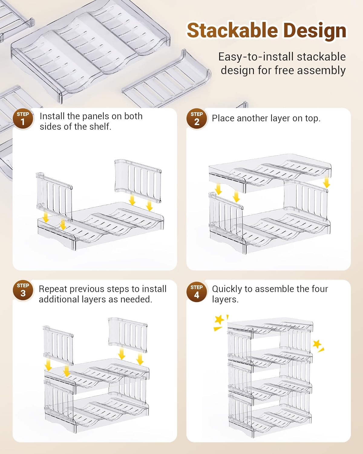 STACKABLE DESIGN AND STURDY CONSTRUCTION: Perfect kitchen organizers and storage, easy to assemble. You can customize and assemble according to your needs in seconds, no tools required. The pantry organization is made from high-quality shatterproof PET material with 2 thick transparent plastic support panels per layer, ensuring stability and preventing wobbling or cracking.US Patent: D1026508- S.