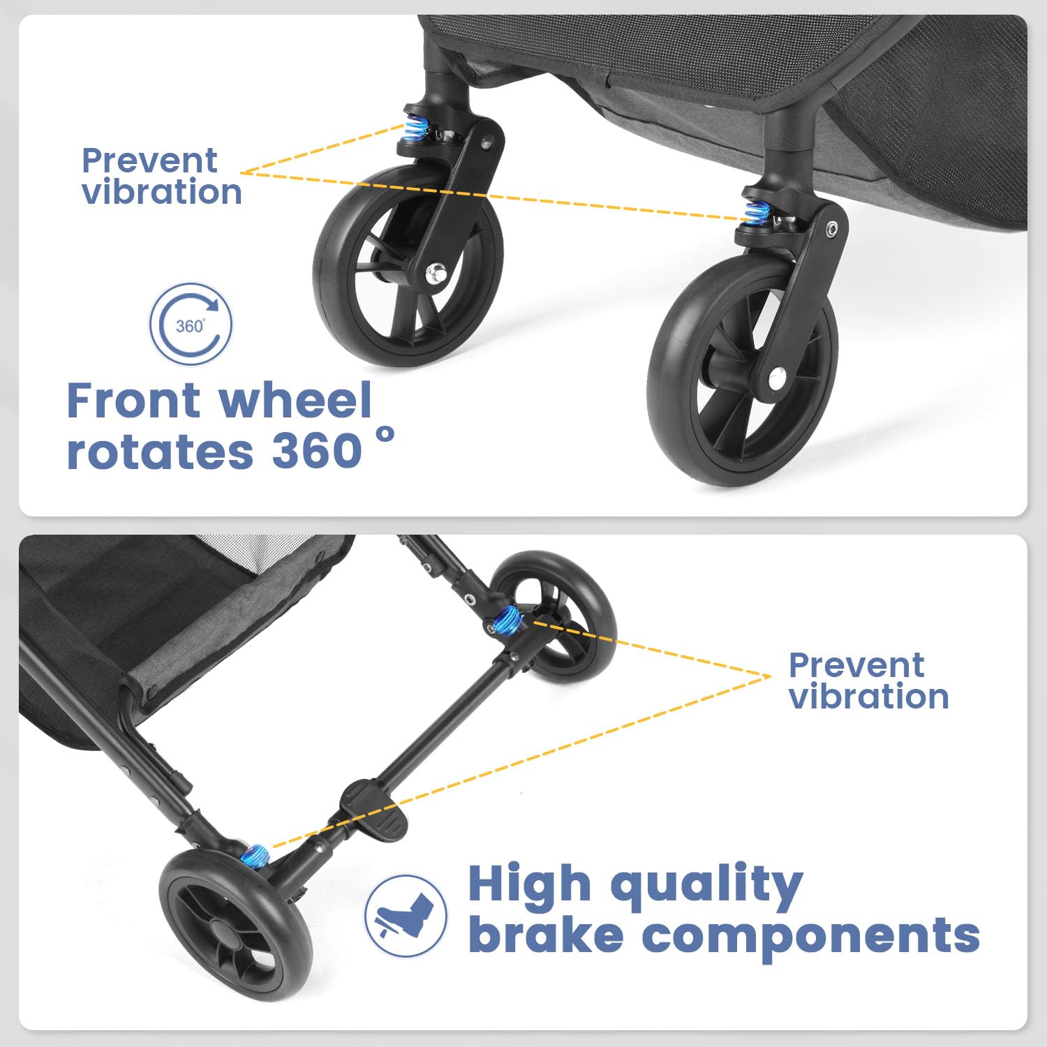 🐱 The intuitive foot brake at the rear wheel quickly locks the stroller in place. 360° rotating front wheels allow you to maneuver easily on most terrain. The shock absorption design of the front and rear wheels provides comfortable riding for pets.