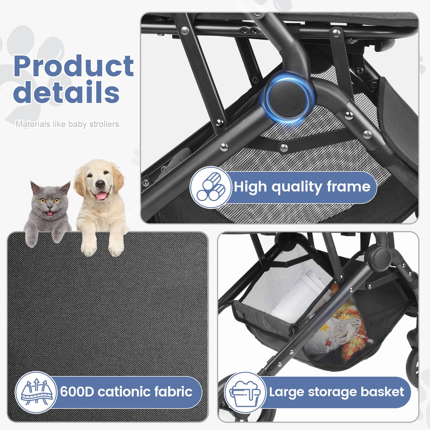 🐾 The reinforced and thickened frame makes the pet stroller more stable and durable. There are mesh panels throughout making sure of the viewability, and airflow, and allowing for humans and dogs to keep interaction anytime anywhere.