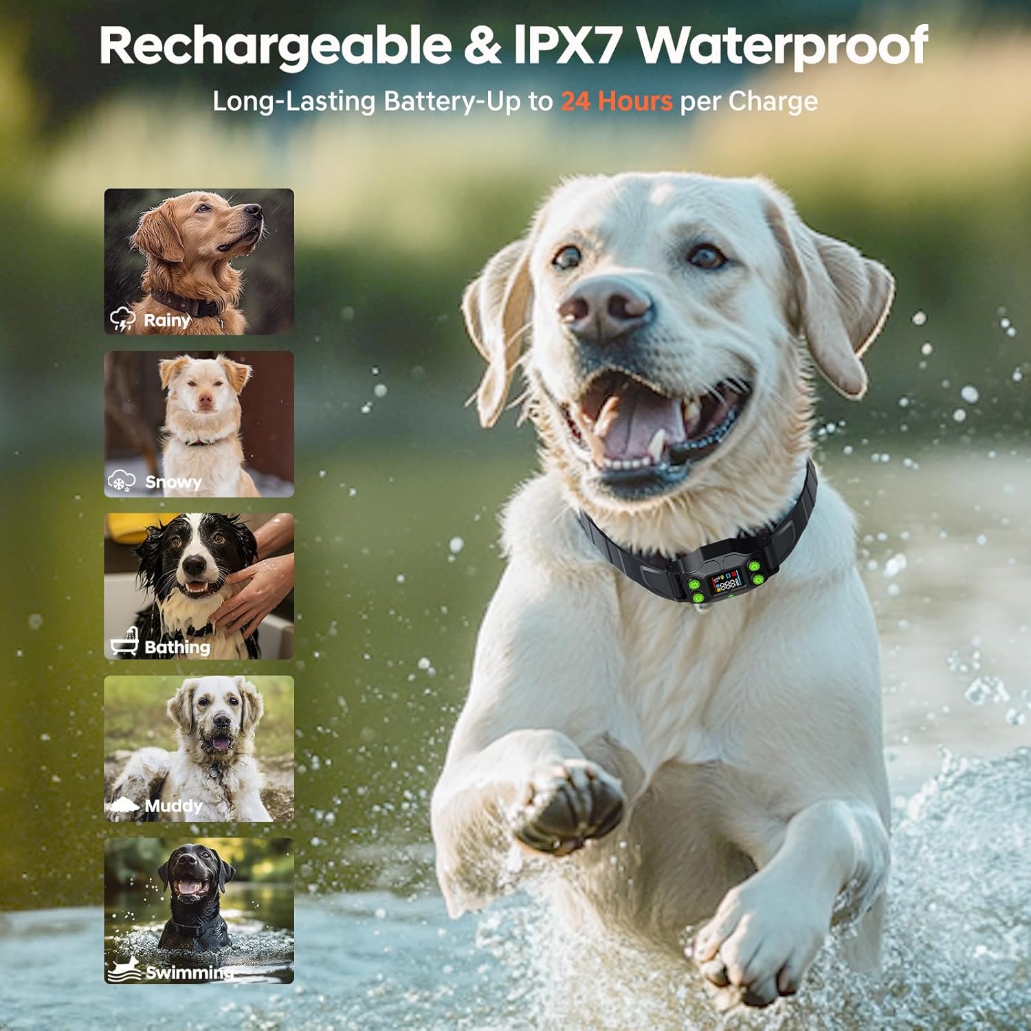 Effortless Setup & & Auto Memory: Only the collar is required, no wiring or additional accessories are required, and say goodbye to complex installation and hidden costs. The color screen displays the status in real time, and the operation is clear at a glance. In addition, the wireless dog fence system automatically saves the safety zone settings, center point, radius and training mode, and is ready to use after powering on, without repeated settings, providing ultimate convenience
