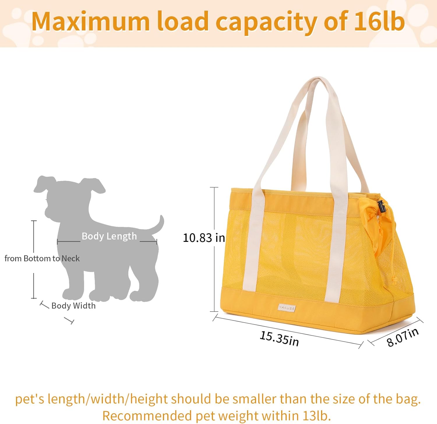 This is a lightweight and portable pet tote bag, simple travel, make outdoor activities easier without burden. The length, width, and height of the product is15.35*8.27*10.83 in,only 0.88 pounds. The maximum weight capacity of this bag is 16 pounds. We recommend cats under 13 pounds and small dogs weighing less than 6 pounds.