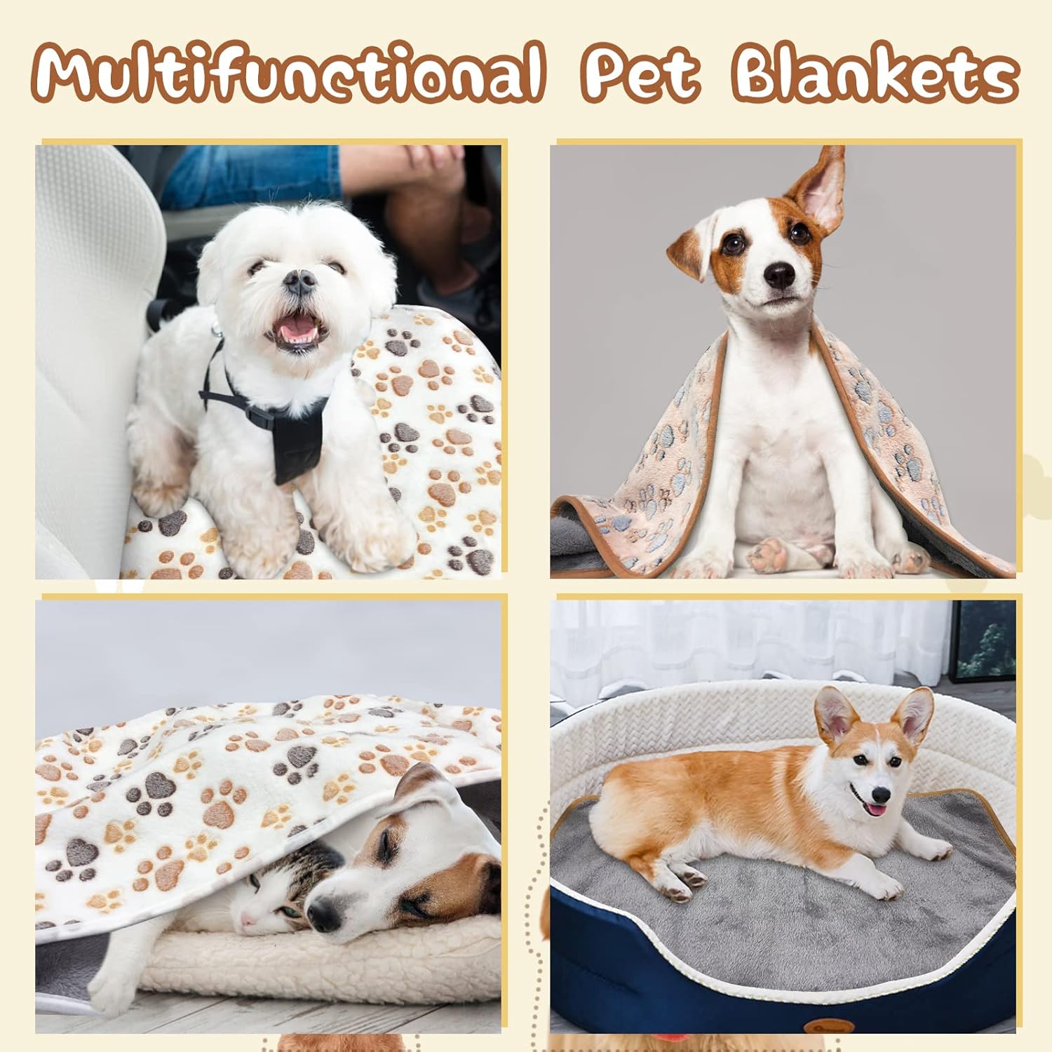 2 pieces blankets: Blanket size 30″×20″ for pets to snuggle; This 2 pack puppy blankets are combination of white and coffee blankets with paw print; Easy and convenient to taking and keeping; Perfect for small, medium and large kittens, cats and dogs such as chihuahua, papillon, pomeranian, teddy, bichon, maltese, yorkshire, french bulldogs, scottish terriers, miniature poodle, pug, etc